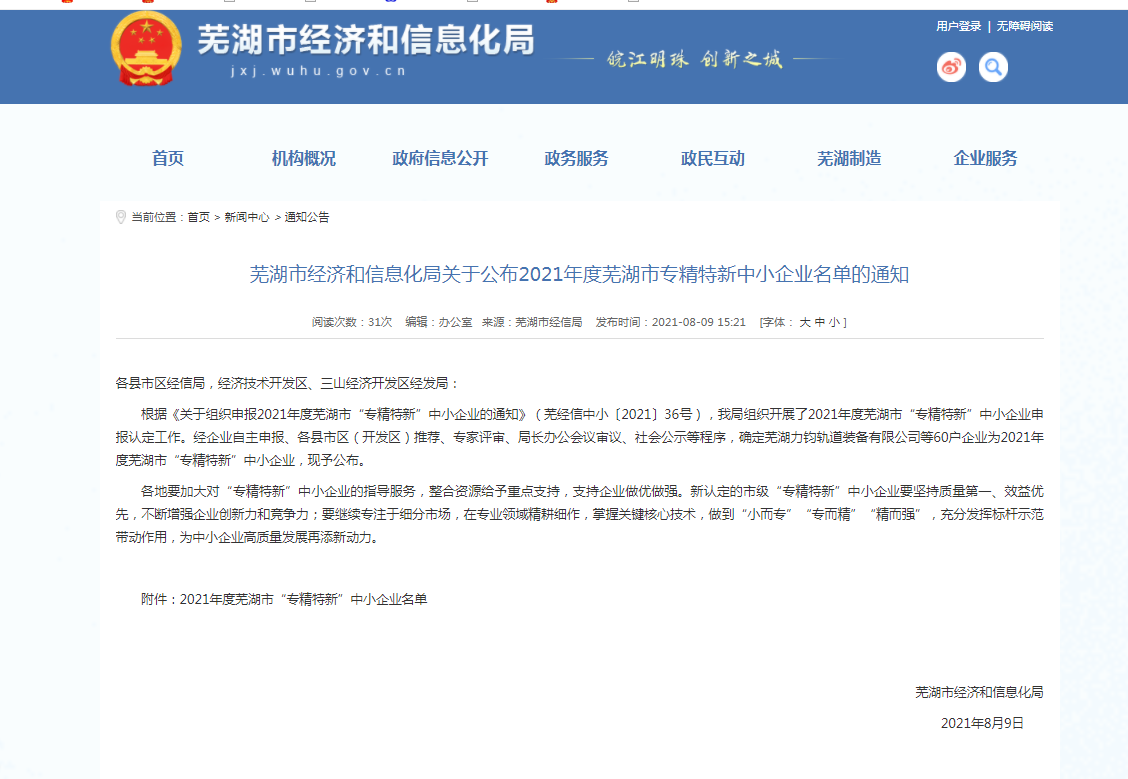 近日,經(jīng)蕪湖市經(jīng)濟(jì)和信息化局嚴(yán)格審核評(píng)定,授予我公司“蕪湖市專精特新中小企業(yè)”榮譽(yù)稱號(hào)。