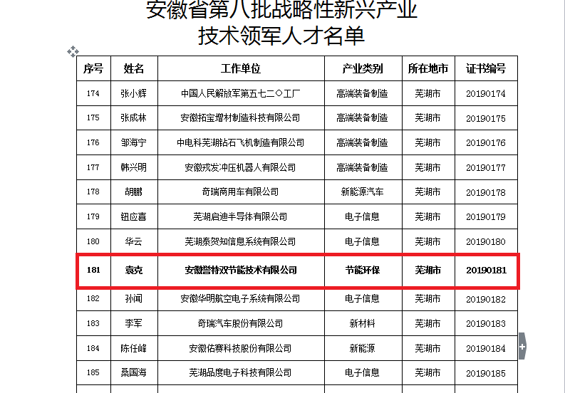 我安徽譽特雙節(jié)能技術(shù)有限公司總經(jīng)理袁克同志榮登榜單,喜獲認定,同時也是蕪湖市唯一的節(jié)能環(huán)保產(chǎn)業(yè)入選單位。該次認定工作,注重向人工智能、高檔數(shù)控機床和機器人、先進軌道交通裝備、節(jié)能與新能源汽車、新材料、生物醫(yī)藥、現(xiàn)代農(nóng)業(yè)機械裝備、現(xiàn)代物流等制造業(yè)重點領(lǐng)域和戰(zhàn)略性新興產(chǎn)業(yè)傾斜。