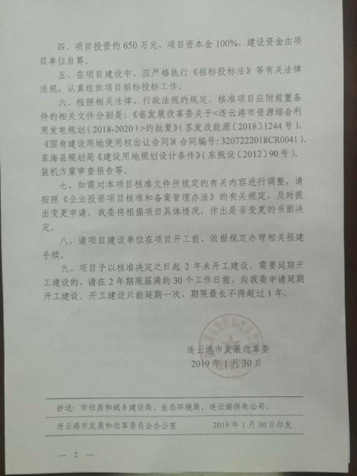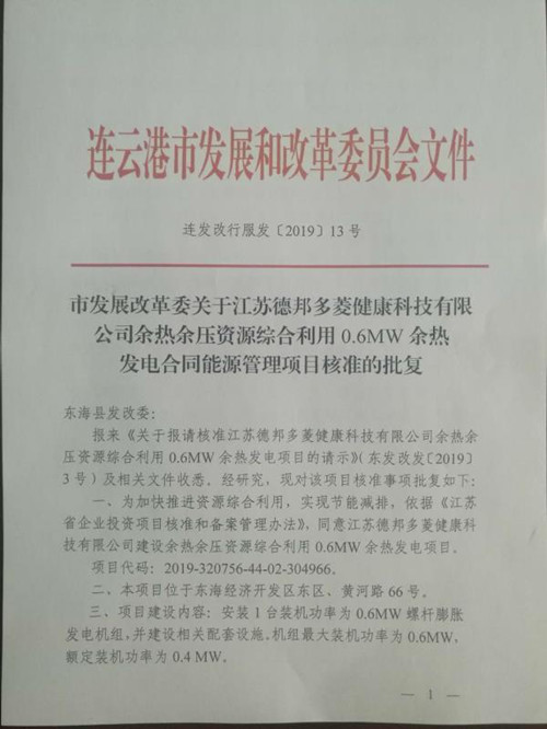 該項目當前進展順利,經(jīng)大力推動,已順利獲取《江蘇省發(fā)展改革委關(guān)于<連云港市資源綜合利用發(fā)電規(guī)劃(2018-2020)>的批復(fù)》(蘇發(fā)改能源〔2018〕1244號)、《連云港市發(fā)展改革委關(guān)于江蘇德邦多菱健康科技有限公司余熱余壓資源綜合利用0.6MW余熱發(fā)電合同能源管理項目核準的批復(fù)》(連發(fā)改行服發(fā)〔2019〕13號)、《東??h發(fā)改委關(guān)于報請核準江蘇德邦多菱健康科技有限公司余熱余壓資源綜合利用0.6MW余熱發(fā)電項目的請示》(東發(fā)改發(fā)〔2019〕3號)、《裝機方案審查報告》等文件和項目核準批文。