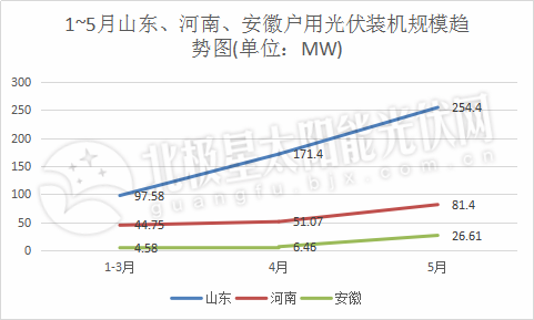從整體來看,戶用市場已經(jīng)回暖,以山東、河南、安徽等為代表的省份裝機規(guī)模直線上升,其中,山東上升幅度較大,1-3月新增97.58MW,4月新增171.4MW,5月新增254.4MW,接近前4個月的裝機總和。