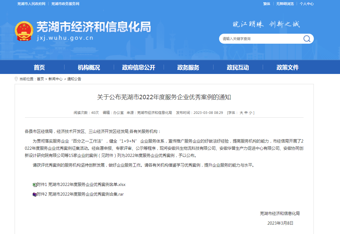 此次蕪湖市2022年度服務企業(yè)優(yōu)秀案例征集工作,由蕪湖市經(jīng)濟和信息化局遴選,旨在貫徹落實服務企業(yè)“百分之一工作法”,健全“1+9+N”企業(yè)服務體系,宣傳推廣服務企業(yè)的好做法好經(jīng)驗,提高服務機構的能力。此次入選案例重點圍繞信息咨詢、技術創(chuàng)新、人才培訓、市場開拓、管理咨詢、質量管理、創(chuàng)業(yè)輔導、投資融資服務、信息化應用服務等服務領域開展遴選工作。