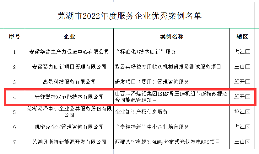 2023年3月8日我公司合作案例——山西森澤煤鋁集團12MW 背壓1#機組節(jié)能技改提效合同能源管理項目,入選蕪湖市2022年度服務企業(yè)優(yōu)秀案例,本次全市共計評選出15家服務企業(yè)優(yōu)秀案例,其中經(jīng)開區(qū)4家,我公司榮列榜單。