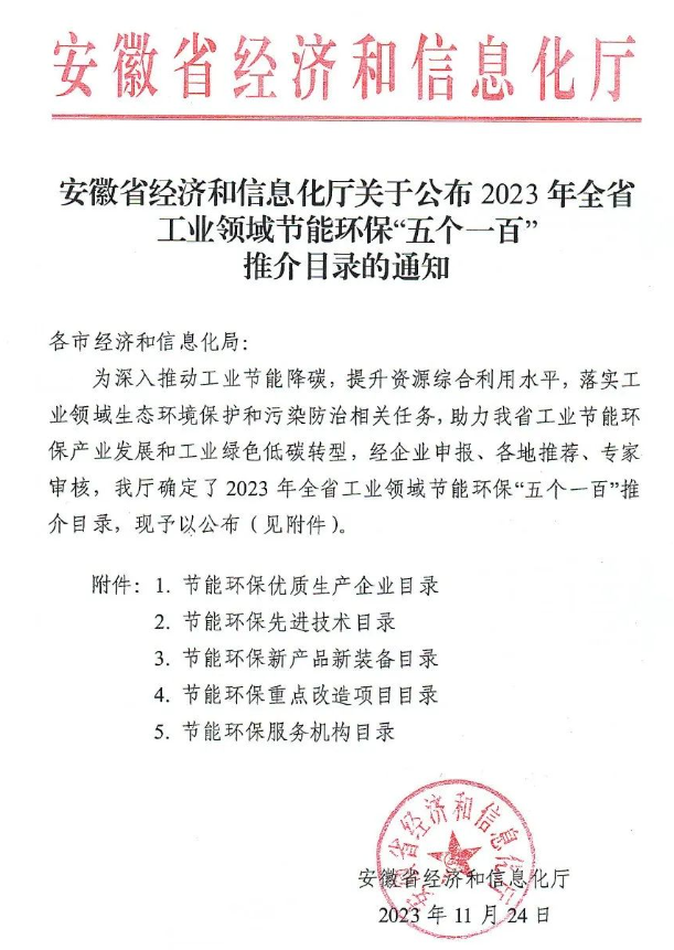 2023年11月27日,安徽省經(jīng)信廳公布2023年度全省工業(yè)領(lǐng)域節(jié)能環(huán)保“五個(gè)一百”推介目錄,我公司三個(gè)項(xiàng)目喜獲認(rèn)定,在此表示熱烈祝賀。