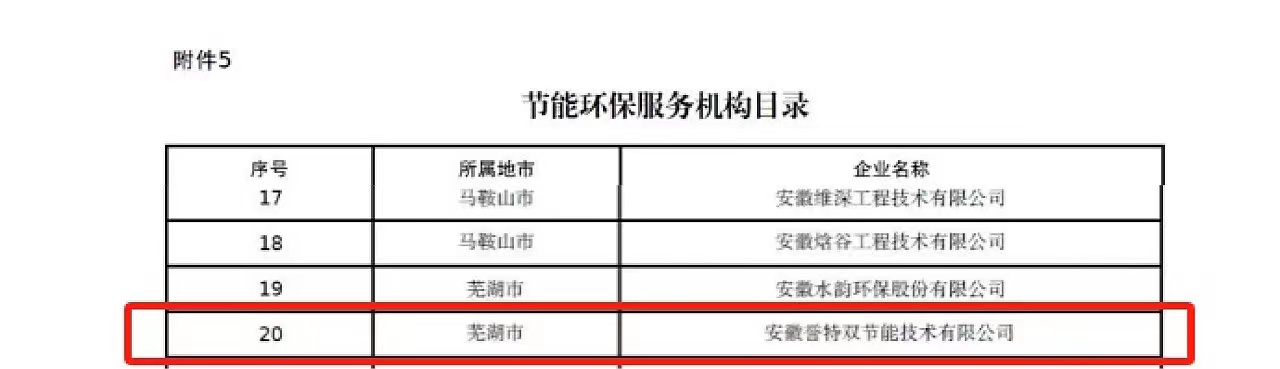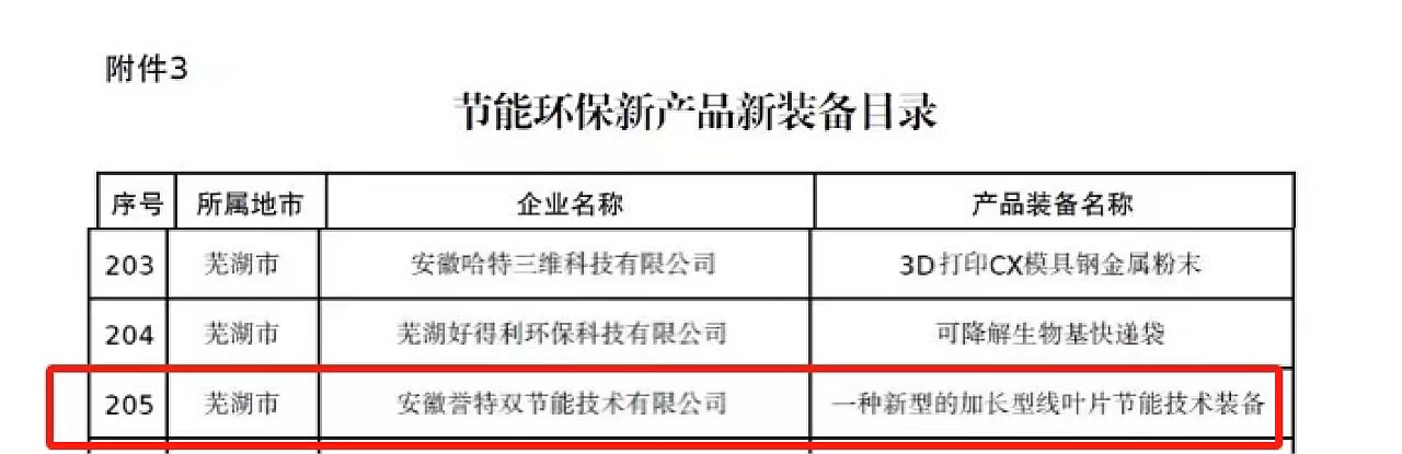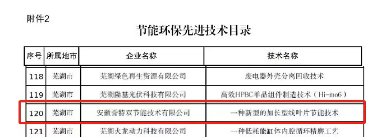 公司分別入選省“節(jié)能環(huán)保服務(wù)機(jī)構(gòu)目錄”、核心技術(shù)“一種新型的加長(zhǎng)型線葉片節(jié)能技術(shù)”入選節(jié)能環(huán)保先進(jìn)技術(shù)目錄、核心產(chǎn)品“一種新型的加長(zhǎng)型線葉片節(jié)能技術(shù)裝備”入選節(jié)能環(huán)保新產(chǎn)品新裝備目錄。其中,節(jié)能環(huán)保服務(wù)機(jī)構(gòu)目錄名單,安徽省全行業(yè)領(lǐng)域共28戶,蕪湖市僅2戶,我公司榮登榜單,此次入選,為公司連續(xù)6年入選,在此表示熱烈祝賀。