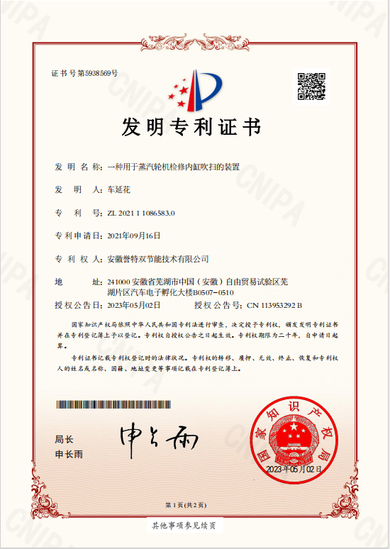 近日,我公司申請的四項發(fā)明專利——“一種采用蒸汽輪機的循環(huán)發(fā)電裝置”、“一種使用蒸汽輪機的發(fā)電機”、“一種用于蒸汽輪機檢修內缸吹掃的裝置”、“一種蒸汽輪機的安全散熱器”,經過受理、一次審查和答辯、實質性審查后,獲得國家知識產權局正式授權。