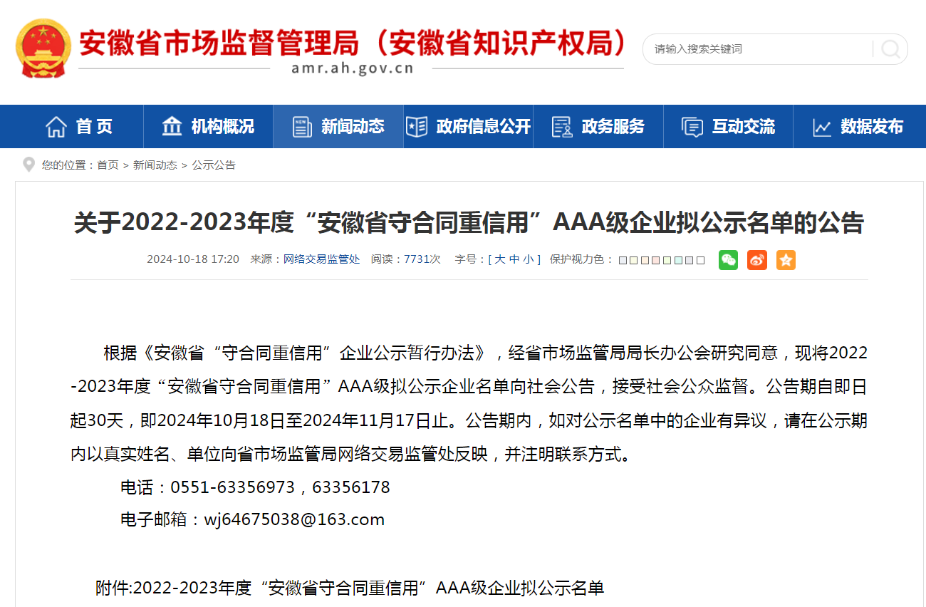 為推動(dòng)企業(yè)誠(chéng)信建設(shè)、賦能企業(yè)高質(zhì)量發(fā)展,安徽省市場(chǎng)監(jiān)督管理局經(jīng)統(tǒng)一部署,組織開(kāi)展了2024年度安徽省“守合同重信用”企業(yè)評(píng)選公示活動(dòng),通過(guò)對(duì)申報(bào)的企業(yè)進(jìn)行資料復(fù)核、征信查詢(xún)、合同執(zhí)行、業(yè)績(jī)數(shù)量、市場(chǎng)口碑、企業(yè)形象、行業(yè)影響等各方面進(jìn)行評(píng)估,經(jīng)嚴(yán)格的實(shí)地核實(shí)、綜合評(píng)判,遴選出一批行業(yè)影響力大、品牌信用度高的經(jīng)營(yíng)發(fā)展態(tài)勢(shì)良好的企業(yè),我公司榮幸被評(píng)選為安徽省2022-2023年度“守合同重信用AAA級(jí)企業(yè)”,省內(nèi)平均每個(gè)地級(jí)市全行業(yè)僅在30家左右,含金量非常高,在此表示熱烈祝賀!