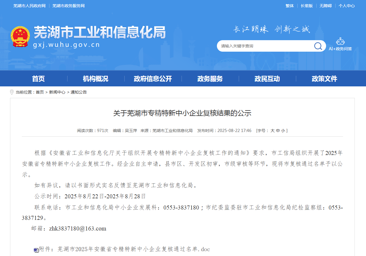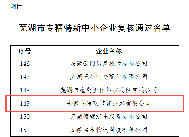 近日,蕪湖市工業(yè)和信息化局公布了“2025年專精特新中小企業(yè)”復核結果,我公司憑借持續(xù)的技術創(chuàng)新能力、扎實的產(chǎn)業(yè)深耕基礎和優(yōu)異的綜合實力表現(xiàn),順利通過復核,繼續(xù)獲評“蕪湖市專精特新中小企業(yè)”榮譽稱號。