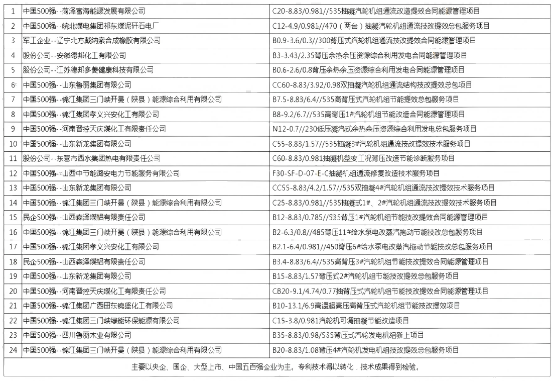 公司創(chuàng)造性的將核心技術(shù)與合同能源管理商務(wù)模式進(jìn)行有機(jī)整合,并成功在安徽、山東、河南、山西、江蘇等地建設(shè)多個(gè)標(biāo)桿業(yè)績(jī),其中,在遼寧北方戴納索合成橡膠、菏澤富海集團(tuán)、山東魯麗集團(tuán)、山東新龍集團(tuán)、德邦化工集團(tuán)、山西晉控集團(tuán)、皖北煤電集團(tuán)、杭州錦江集團(tuán)、中國(guó)節(jié)能集團(tuán)、森澤煤鋁集團(tuán)等大型國(guó)有、全球五百?gòu)?qiáng)、上市企業(yè)落地實(shí)施,具有顯著的示范作用。
